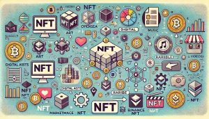 DALL·E 2024-06-29 09.49.43 – A digital art image depicting the concept of NFT investment for beginners. The image includes a simplified illustration of a blockchain with interconn X Facebook 2024.06.29 FacebooktwitterHatenaPocketCopy